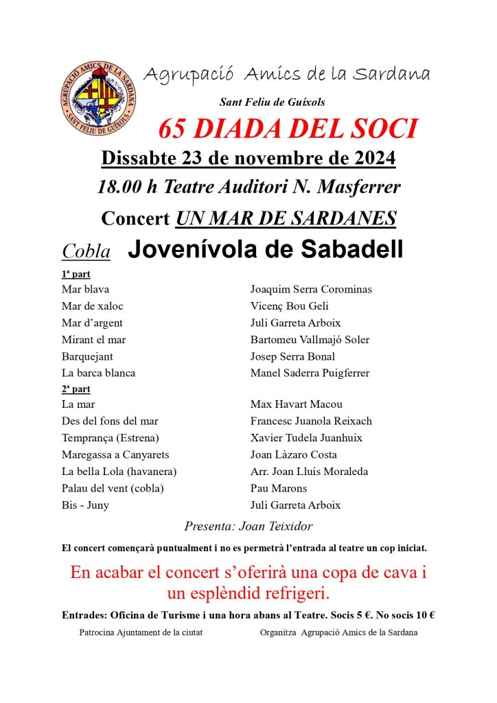 L’Agrupació Amics de la Sardana de Sant Feliu de Guíxols organitza per aquest dissabte 23 de novembre la 65a edició de la seva Diada del Soci. L’activitat, que tindrà lloc al Teatre Auditori Narcís Masferrer, començarà a les 6 de la tarda.