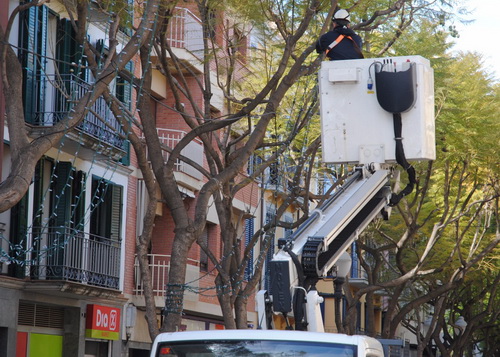 operaris de l’empresa d’enllumenats varen retirar la setmana passada els llums que guarnien la Rambla Vidal que han guarnit l’espai durant les diades nadalenques i que es varen mantenir pel pas de les carrosses i comparses de Carnaval.
