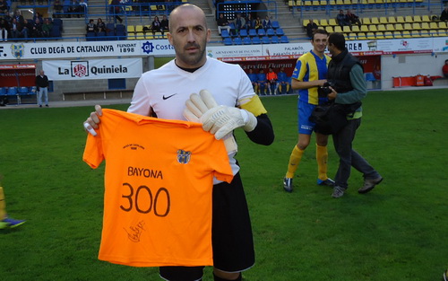 El porter ganxó del Palamós Club de Futbol, Joan Bayona, de 35 anys d’edat, ha estat homenatjat per la Penya Sport amb motiu dels 300 partits a la porteria de l’entitat palamosina tot i que en el global de la seva carrera en suma 400.