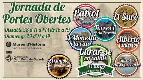 Aquest cap de setmana se celebra a Sant Feliu de Guíxols el desè aniversari de l’Espai del Metge i la Salut Rural. Per aquest motiu es programa una jornada de portes obertes per als dos dies. En concret el dissabte de 11 a 14h i de 16 a 19h, i el diumenge de les 11 a les 14h. En aquesta jornada amb el museu obert es podran contemplar les diferents mostres obertes al Monestir ara mateix: “Patxot, científic, mecenes, l’home”, Torres i Porta Ferrada, El Suro, Albertí, Guíxols Eines i Creences, El Monestir i la Vila, Curar-se en Salut i es pot anar també a l’espai gastronòmic del Ginjoler. Aquesta activitat està organitzada per l’Àrea de Patrimoni Cultural i Museu de l’Ajuntament de Sant Feliu de Guíxols.