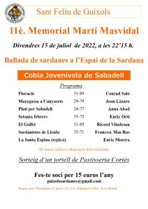 Aquest divendres 15 de juliol, a les 22.15 hores, tindrà lloc la celebració de l’11è Memorial Martí Masvidal, amb una ballada de Sardanes amb la Cobla Jovenívola de Sabadell.