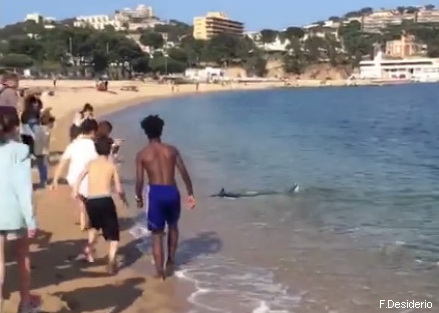 La tarda d’aquest dissabte un peix espasa es deixava veure a la vora de la platja de Sant Feliu de Guíxols, presencia que es va convertir en l’entreteniment dels més petits que seguien el seu recorregut i d’un destacat grup de gent que el filmaven i fotografiaven amb els seus dispositius mòbils per tot seguit penjar-ho a les xarxes socials.