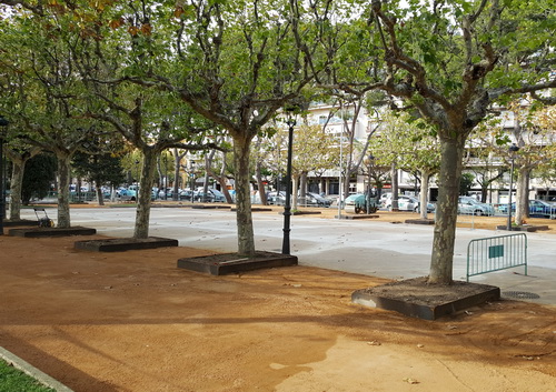 Ja es pot comprovar la futura estètica amb l’eliminació d’obstacles, amb escocells d’acer-corten pels arbres, instal·lació elèctrica, nous fanals, la base sòlida amb pendents per a l’aigua de pluja, que es complementarà amb un nou enjardinament.