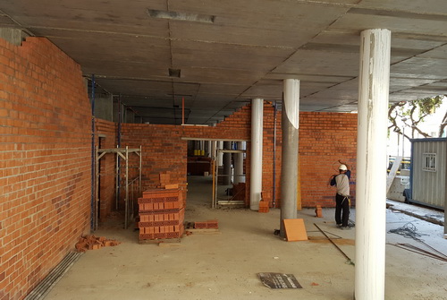 Un cop que s’han superat les etapes de construcció dels fonaments i l’estructura de formigó del futur Hotel Elke de Sant Feliu de Guíxols, els operaris ja estan fent les parets de tanca i de separació dels diferents espais en diverses plantes, tal i com es pot observar des del carrer.