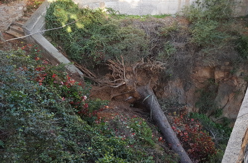 Uns dies abans va caure una gran tempesta que, en principi, semblava ser la causa del descalçament de l’arbre però sembla ser que una fuita d’aigua en un xalet de la part alta fou la causa que va provocar el despreniment i s’estudia pels tècnics si serà necessària fer una obra de contenció per evitar mals majors.