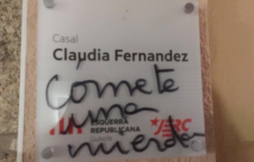 El fet que la placa pintada del casal republicà porti el nom de Claudia Fernández, en homenatge a l’activista morta fa uns anys, encara genera més rebuig envers els intolerants que cometen aquestes accions.