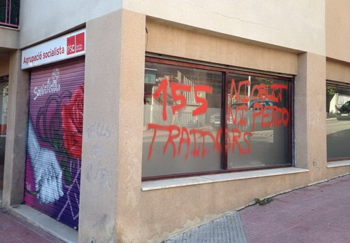 Abans es podia comprovar com, amb nocturnitat, uns incontrolats havien arrabassat un cop més l’estelada del passeig, mètode que també s’ha aplicat per portar a terme aquesta acció en el local propietat del PSC al barri de Vilartagues amb el missatge “155, ni oblit ni perdò, traidors”.