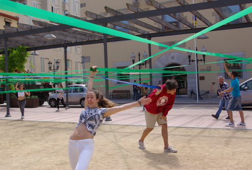 Els dilluns a les 12 del migdia a la plaça del Mercat de Sant Feliu de Guíxols, quan les al rellotge de l’ajuntament hi tocaven les notes de la sardana “Juny”, es va veure envaïda per desenes de joves amb cintes de colors a la ma que corrent en un encreuament frenètic l’han embolicat de dalt a baix en pocs minuts.