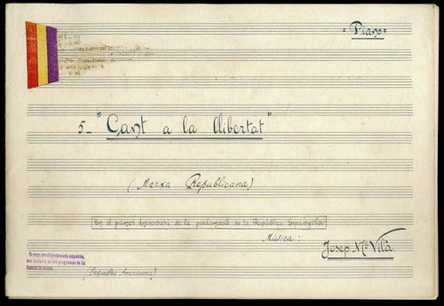 Enguany es compleixen 87 anys de la proclamació de la Segona República espanyola, el 14 d’abril de 1931. L’esdeveniment va ser molt ben acollit entre molts ciutadans, entre ells el músic i compositor guixolenc Josep M. Vilà Gandol. Així es demostra a partir d’un document que es conserva en el seu fons, a l’Arxiu Municipal, i del qual en mostrem la caràtula. Es tracta de la partitura per a piano de l’obra titulada “Cant a la llibertat (Marxa Republicana)” que el mestre Vilà fa constar que havia musicat “En el primer aniversari de la proclamació de la República”, tot adjuntant-hi l’eloqüent bandera tricolor.