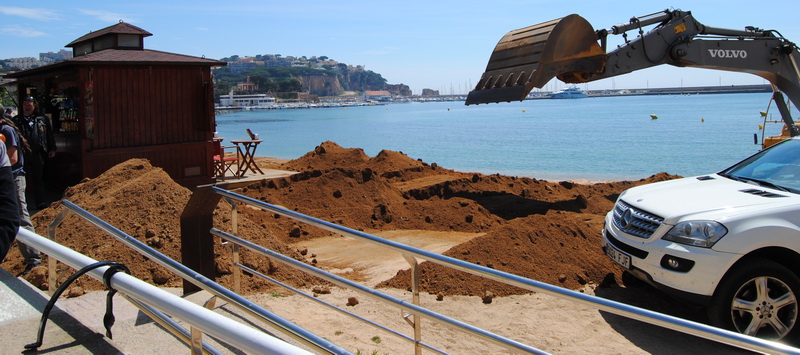 L’empresa guixolenca Luque, ha fet un gran desplegament de màquines retroexcavadores, camions de càrrega, altres de transport de maquinària pesada i un destacat equip d’operaris per tal de transportar i distribuir els 2.000 m³ de sorra al nivell de les fites que s’havien col·locat prèviament per tal de marcar els desnivells fins l’aigua.