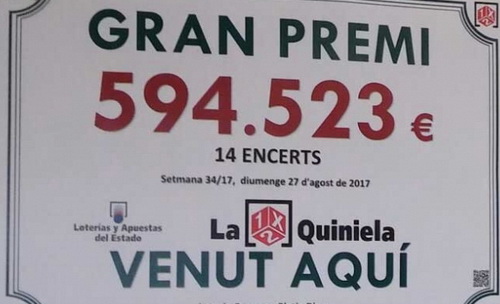 Un veí de Platja d’Aro ha estat l’únic encertant de 14 de la segona jornada de la travessa, segons va informar ahir Loterías y Apuestas del Estado (LAE). En total, s’ha embutxacat poc més de 594.000 euros d’una butlleta guanyadora que aquest client habitual va segellar a l’administració de loteria número 2 de Platja d’Aro, situada a l’avinguda de s’Agaró. Aquesta administració, anomenada Loteria Carmen, ja va repartir un segon premi de la grossa de Nadal, entre d’altres. Més informació a diari El Punt Avui