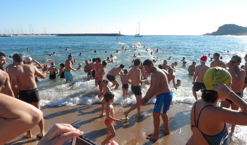 Més de 250 persones es varen llençar a l’aigua de la badia de Sant Feliu de Guíxols convocats per l’Aquàtic Club Xaloc pels volts de la 1 del migdia. El temps esplèndid del matí va animar no només als participants sinó que centenars de persones es varen acostar fins la platja per contemplar als atrevits banyistes que realitzaven el ja tradicional primer bany del 2015.