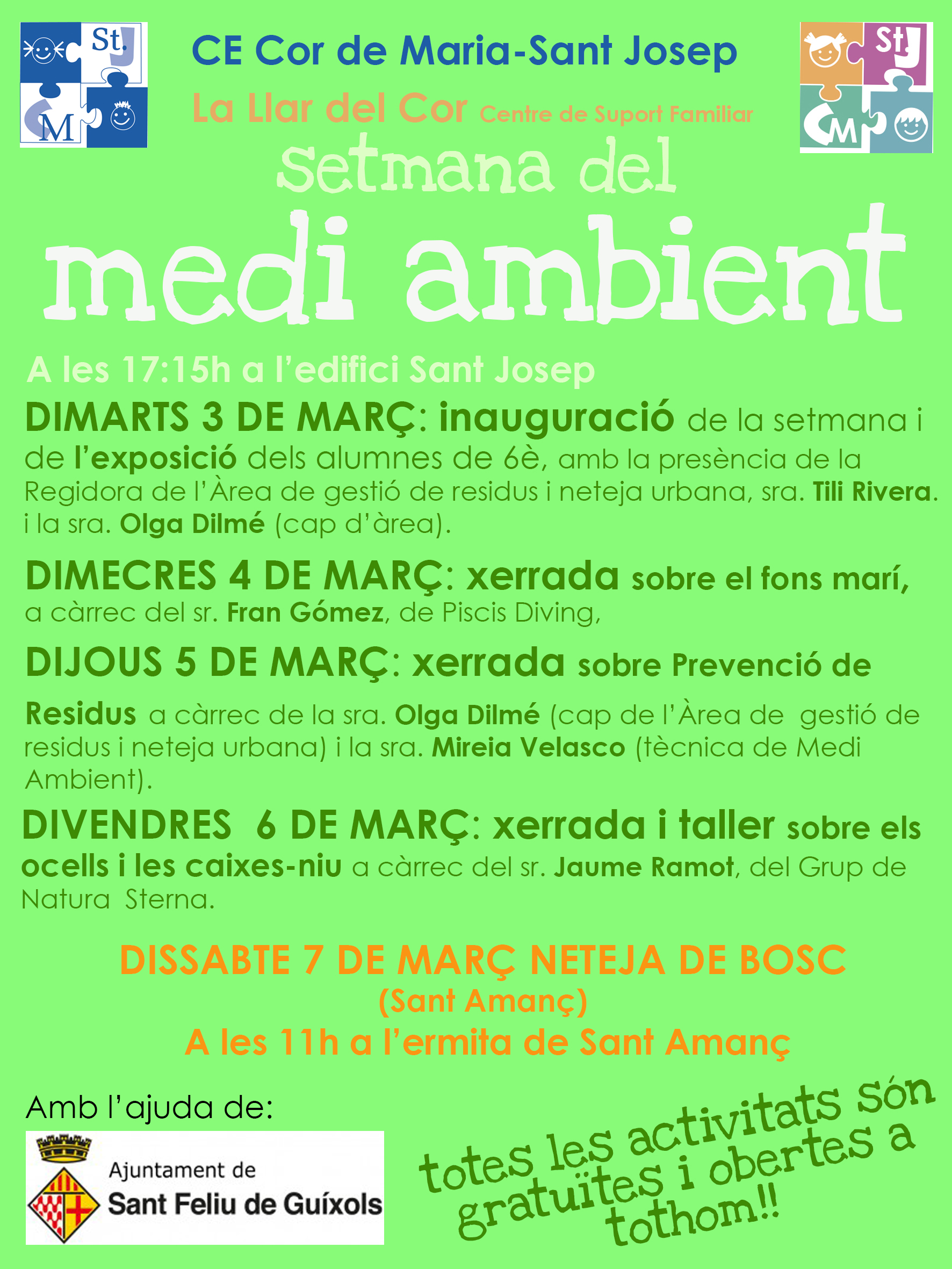 El CE Cor de Maria-Sant Josep ha organitzat amb l’Àrea de Recollida de Residus i Neteja Urbana de l’Ajuntament de Sant Feliu de Guíxols, està portant a terme un seguit d’activitats per a la “Setmana del Medi Ambient” que es celebra fins al proper dissabte dia 7 de març.