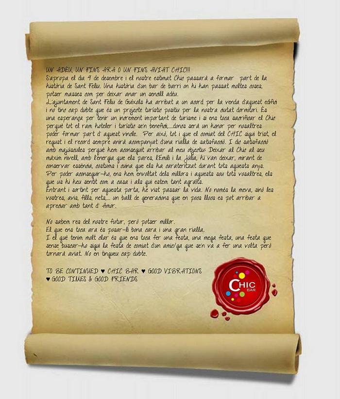 Amb la nova propietat, aquest local desapareixerà, al menys en aquest espai, i la persona que el regenta ha publicat a les xarxes socials una nota de comiat a tots aquells que han gaudit d’aquest establiment històric que en els darrers anys ha fidelitzat un important gruix de clients i que deixa entreveure que l’activitat pot continuar en un altre emplaçament. Si voleu accedir al seu contingut, cliqueu damunt del pergamí que reproduïm en l’arxiu que es troba al peu d’aquesta notícia per ampliar-lo: