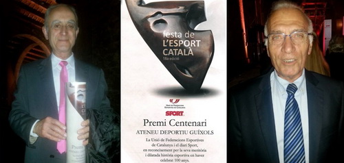 El passat dilluns, 15 de desembre en Romà Corominas com a president del Ateneu Deportiu Guíxols i l.Emili Vilert com a President d’Honor del Centenari del Ateneu recollien en el marc la 18a edició de la Festa de l’Esport Català i de la mà de la Unio de Federacions esportives el reconeixament dels 100 anys de historia del Club de futbol mes antic de la ciutat.