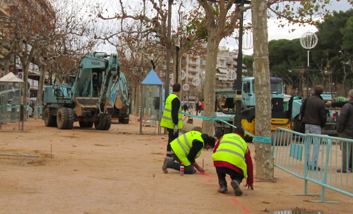 Aquest dimarts les màquines excavadores, piconadores i una brigada d’operaris han estat realitzant les obres d’estabilització del sòl natural, tractament pavimentació amb sauló sòlid a la zona de la parada de taxis del Passeig del Mar i confluència amb la Rambla Vidal de Sant Feliu, treballs que també es porten a terme en diversos trams del carril-bici realitzats per l’empresa Massachs i que té un cost aproximat als 47.500 euros.