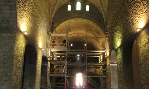 Pel que fa a les obres estan refent la volta del cor. S’asseguren les juntes entre les pedres, de manera que no caigui pols.