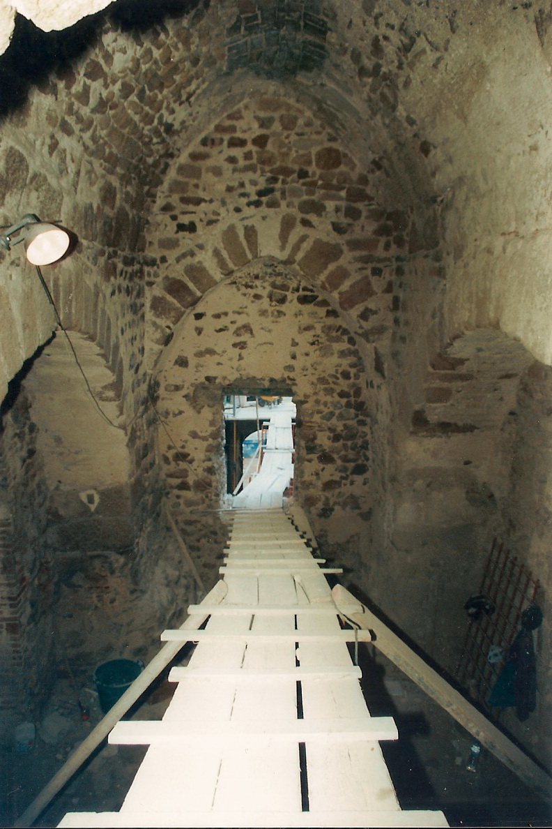 Tot seguit reproduïm algunes fotografies interiors de les torres, del campanar i de les passeres que travessaven la Torre del Corn fa deu anys, quan es realitzaven les obres de coberta de les arcuacions per tal d’assegurar-ne la seva conservació.