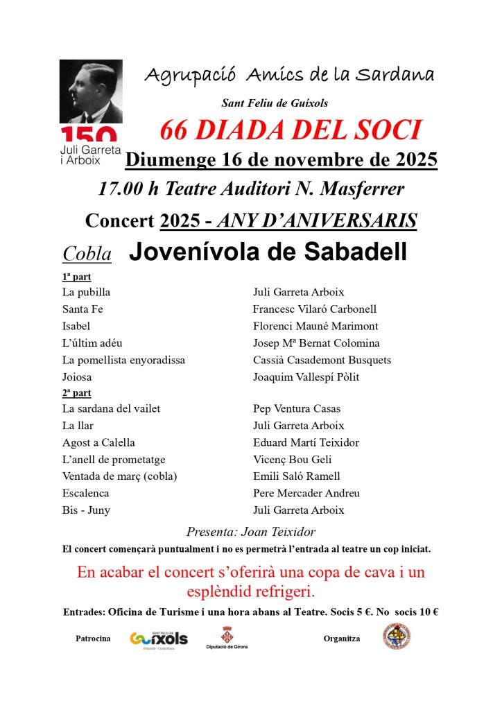L’Agrupació Amics de la Sardana ja té a punt una nova edició, la que suma 66, de la seva Diada de Soci. La proposta donarà inici diumenge a les 5 de la tarda al Teatre Auditori Narcís Masferrer, comptarà amb l’actuació de la cobla Jovenívola de Sabadell i amb Joan Teixidor com a mestre de cerimònies.