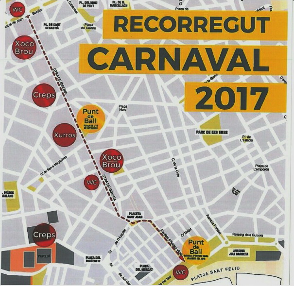 El Carnaval torna amb nou itinerari recuperant el recorregut per la carretera de Girona que s’ha engalanat per a l’ocasió amb pancartes farcides de motius carnavalescos fins desembocar a la placeta Sant Joan, per on passaran els participants fins enfilar la Rambla Vidal i finalitzant al Passeig del Mar. Al peu d’aquesta notícia hi trobareu el plànol amb els punts de ball, wc, xocolata, brou, creps, xurros, etc.