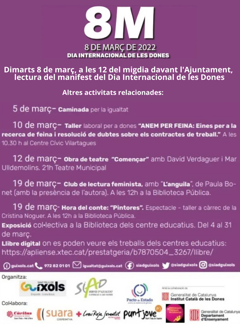 Aquest dimarts 8 de març, en commemoració del Dia Internacional de les Dones, es farà la lectura del manifest davant l’Ajuntament a partir de les 12 del migdia. A més, coincidint amb aquesta lectura, al mateix emplaçament, d’11 a 13 hores, hi haurà una parada informativa.