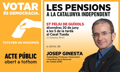 El proper divendres 20 de juny a les 5 de la tarda al Casal de Tueda, la secció local d’ERC a Sant Feliu de Guíxols organitzarà una xerrada per parlar sobre el futur de les pensions amb el títol “Les pensions a la Catalunya independent”.