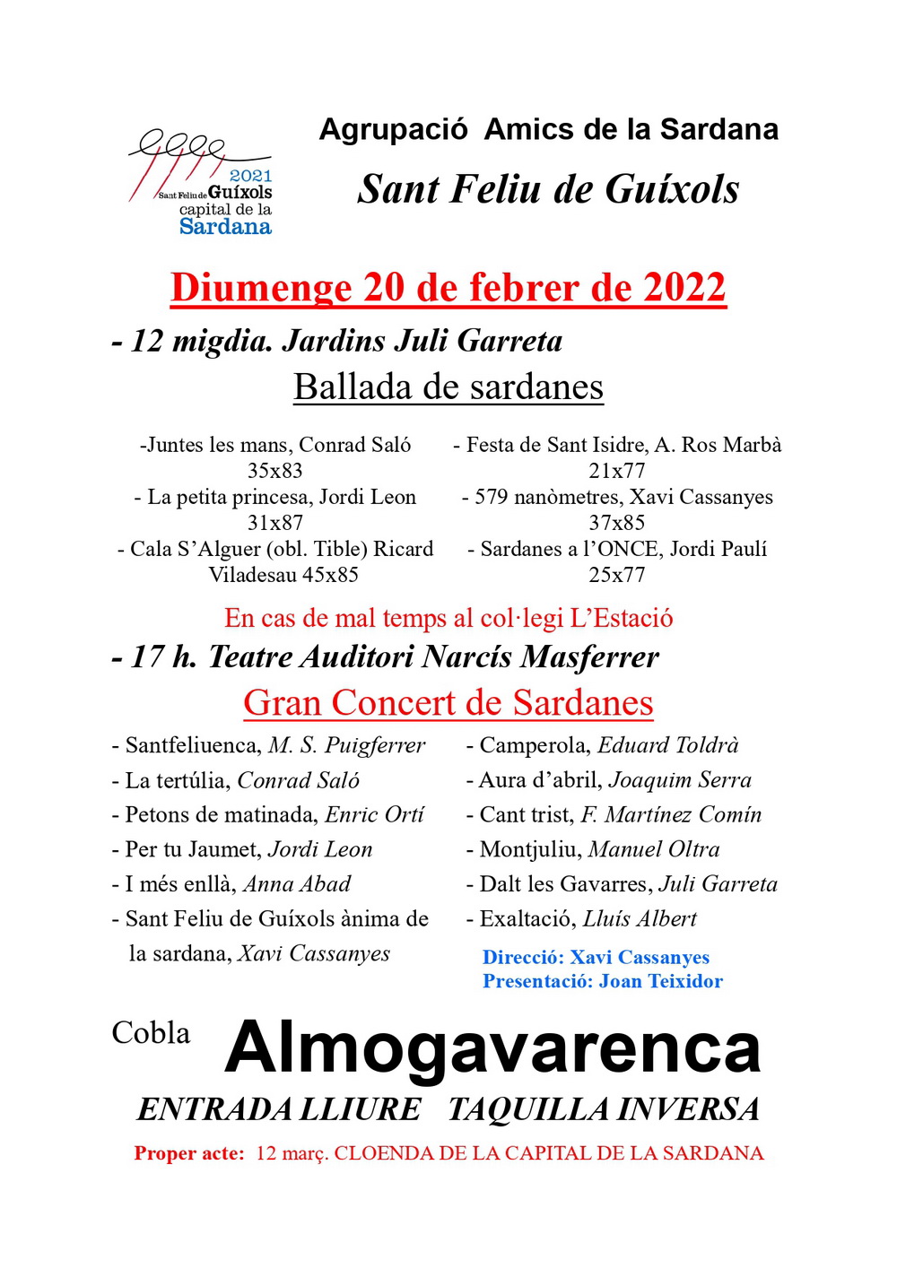 Aquest diumenge 20 de febrer a les 12h als Jardins Juli Garreta, l’Agrupació Amics de la Sardana organitza una ballada de sardanes amb la cobla Almogaverenca. En cas de mal temps es farà al col·legi de l’Estació. I a les 17h al Teatre Auditori Municipal Narcís Masferrer Gran Concert de Sardanes amb la cobla Almogaverenca. Dirigit per Xavi Cassanyes i presentat per Joan Teixidor. Taquilla inversa.
