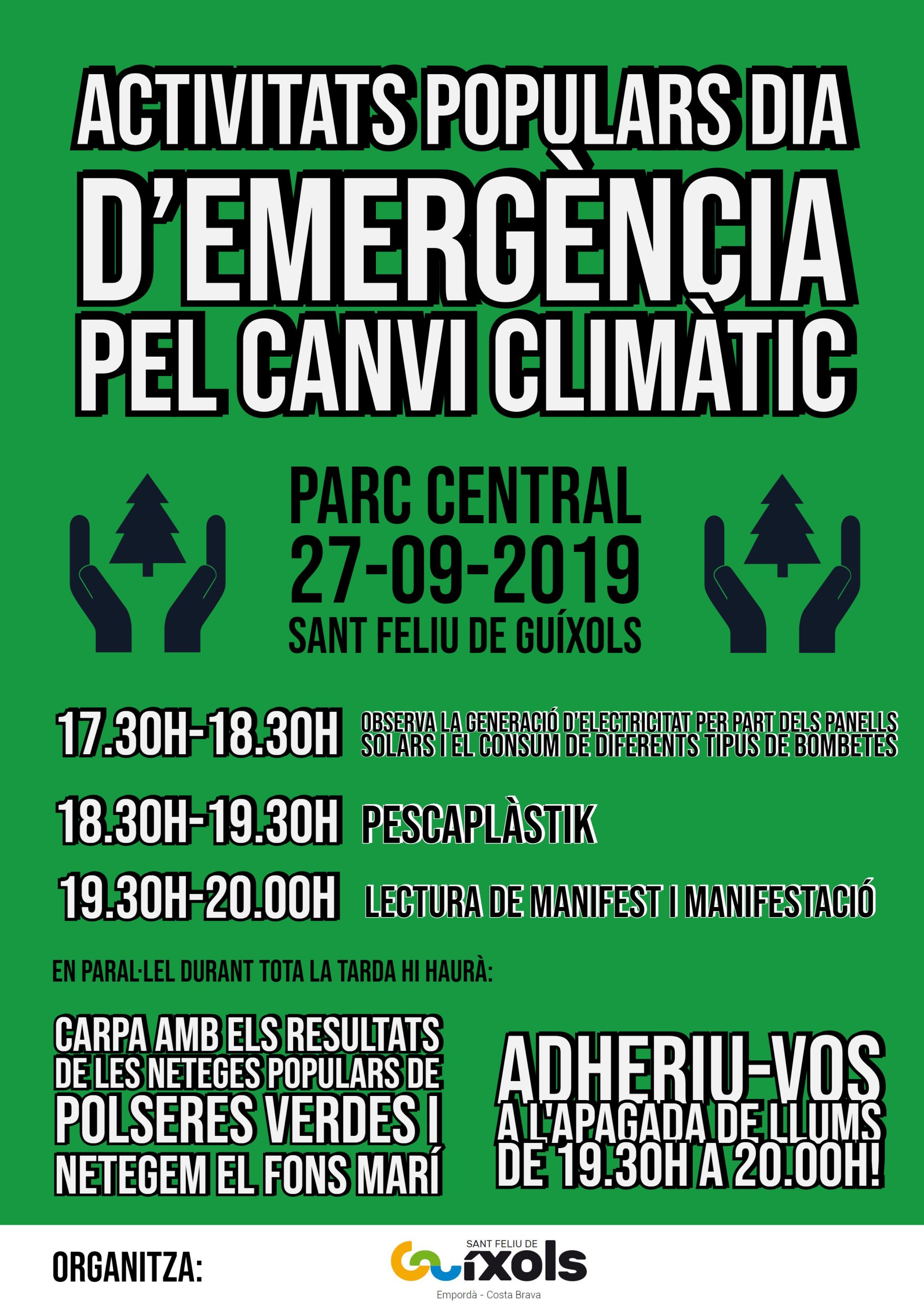 Amb l’objectiu de donar suport a la declaració d’emergència climàtica que va aprovar la Generalitat de Catalunya, i també a totes les activitats que s’organitzen arreu del món sota el nom de “Vaga Mundial pel Clima”, l’ajuntament de Sant Feliu de Guíxols ha preparat diverses activitats durant tota la jornada que acabaran amb una declaració i manifestació al Parc Central.