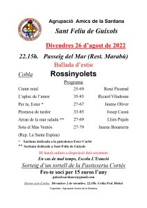 L’Agrupació Amics de la Sardana ha organitzat una ballada d’estiu amb la Cobla Rossinyolets. Serà aquest divendres 26 d’agost a partir de les 22.15 hores a l’escenari del Passeig del Mar, a l’alçada del Restaurant Marabú.