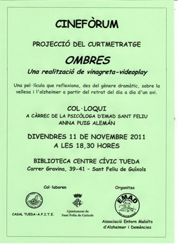 La projecció és una alternativa a la projecció de l’audiovisual “Alzheimer, un repte a l’estima” programat pel passat dia 30 de setembre amb motiu del Dia de l’Alzheimer i que per motius tècnics no es va poder projectar.