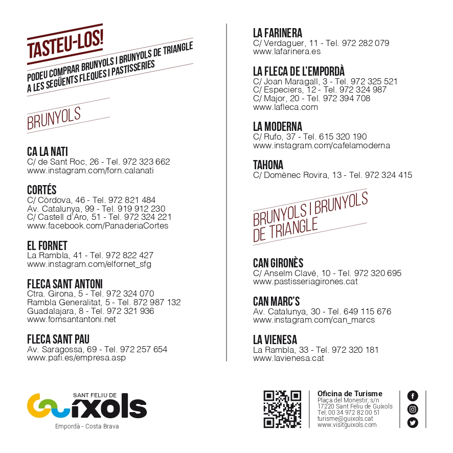 Un any més per Setmana Santa, els brunyols son els protagonistes de les fleques i pastisseries de Sant Feliu de Guíxols. Triangulars i fets seguint una recepta diferent que a la resta de l’Empordà, són tota una icona de la nostre població. Si voleu tastar aquesta recepta tan dolça, tradicional, típica i exclusiva ganxona, tan sols heu de visitar les fleques i pastisseries de la nostra ciutat.