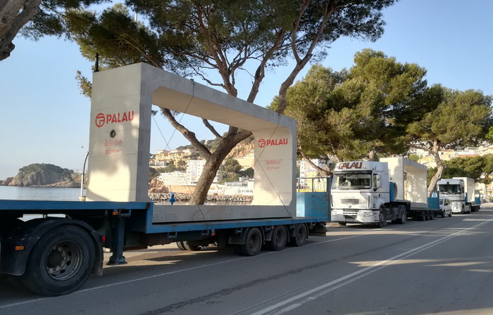 Aquest divendres 27 d’abril una caravana de camions de grans dimensions han transportat fins a Sant Feliu de Guíxols vuit calaixos de formigó del total que conformaran l’estructura de l’ampliació de la canalització, exigida per l’Agència Catalana de l’Aigua (ACA), per realitzar una modificació del recorregut que va des del l’alçada del passeig fins la desembocadura de la riera del monestir, a tocar de la platja de Can Rius.