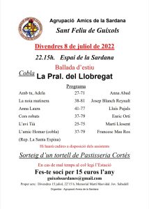 Aquest divendres 8 de juliol, l’Agrupació Amics de la Sardana ha organitzat una ballada d’estiu a partir de les 22.15 hores a l’Espai de la Sardana als Jardins Juli Garreta. L’actuació anirà a càrrec de la cobla La Principal del Llobregat. Podeu consultar el programa i més informació a la imatge adjunta.