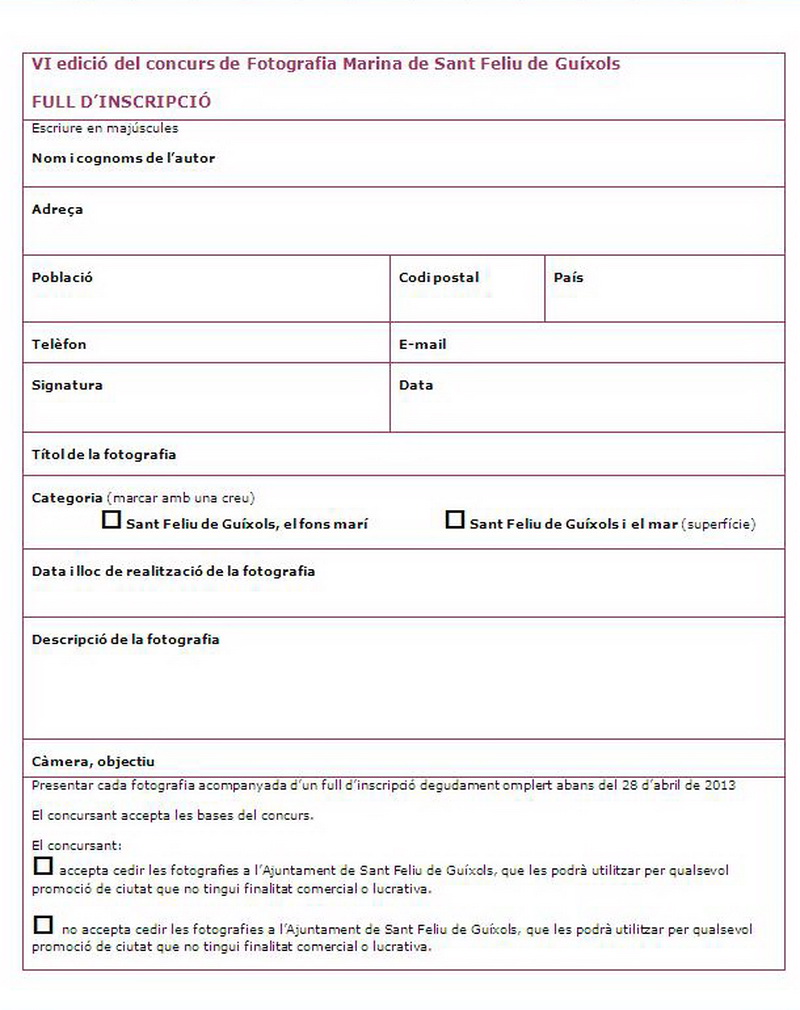 16.- El full d’inscripció es trobarà a la disposició a: la plana web de l’Ajuntament www.guixols.cat, a l’oficina de turisme (Plaça del Monestir s/n, 17220 Sant Feliu de Guíxols) i a l’Àrea Guíxols Desenvolupament (C/ Enamorats, 65-99, 17220 Sant Feliu de Guíxols)