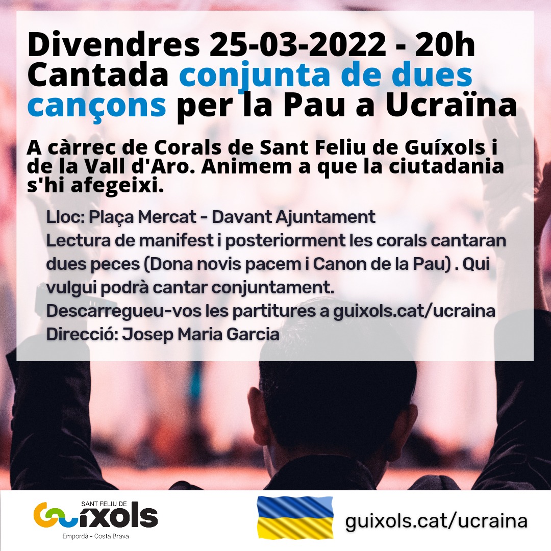 Cantada per la pau de corals de Sant Feliu de Guíxols i la Vall d’Aro aquest divendres 25 de març a les 8 del vespre a la Plaça del Mercat 1 d’Octubre.