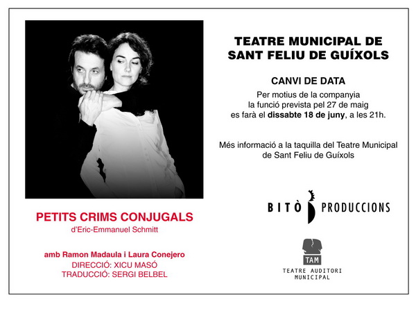 La productora de l’obra “Petits crims conjugals”, va comunicar a l’Ajuntament que l’obra programada dins de la campanya de teatre “Guíxols Escena”, s’havia de traslladar de data per “motius de la companyia” (que tenen a veure amb compromisos personals de l’actor Ramon Madaula).