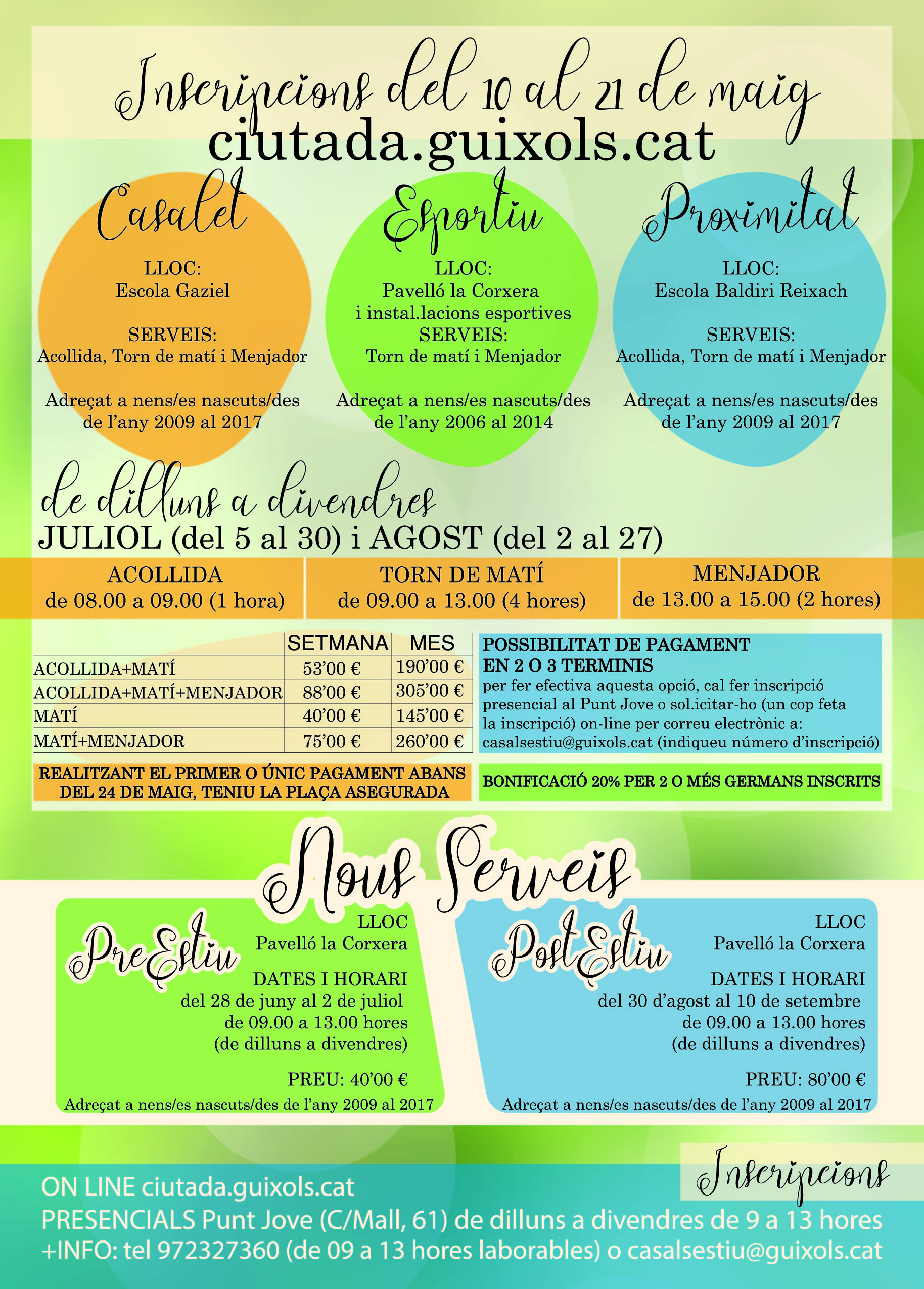 - Les inscripcions es canalitzen al web ciutada.guixols.cat o bé presencialment al Punt Jove (carrer del Mall, nº61 – Edifici Les Vetlladores, de dilluns a divendres de 09 a 13h, tel 972 32 73 60). En tots els casos, fent les inscripcions dins del període i realitzant el primer o únic pagament abans del 24 de maig, es té la plaça asegurada.