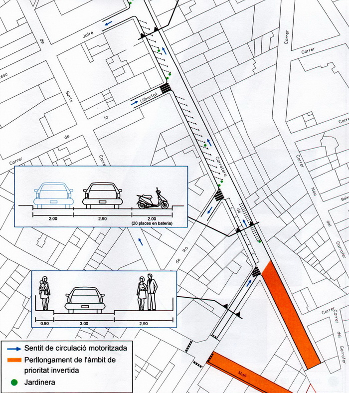 -La redefinició de l’àmbit entre la placeta de Sant Joan i el carrer Mercè amb canvi de sentit a la carretera Girona entre la placeta i el carrer Jofre que seria només de sentit ascendent, creant noves places d’aparcament.