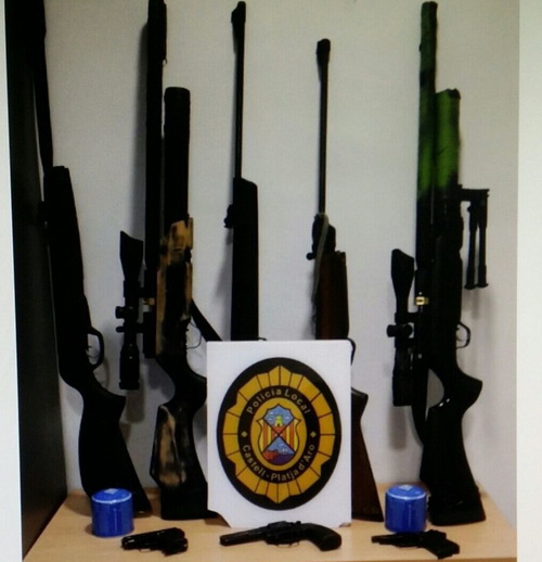 Després la policia va entrar i va comissar totes les armes que hi havia escampades per la casa i també les bombones de butà. Les armes, que l’home havia revestit i adornat, eren en realitat de balins, de les que només necessiten una guia dispensada per la policia o l’Ajuntament per poder-les tenir. I després del comís, l’home va tornar a la policia local a dir que n’havia comprat una altra i que volia que li fessin la guia. Però ateses les circumstàncies, la policia aquest cop la hi va denegar. No és el primer cop que la policia ha d’intervenir en incidents causats per aquest home. Setmanes abans, els Mossos van haver d’escortar a la casa una metgessa del CAP que havia d’anar a fer una visita a domicili a la dona i que es va espantar quan va arribar i li va sortir un home vestit de Rambo, amb una cinta al cap i una falç al cinto.