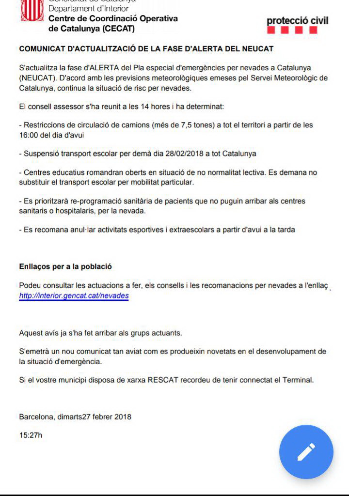 Comunicat actualitzat del Centre de Coordinació Operativa de Catalunya:
