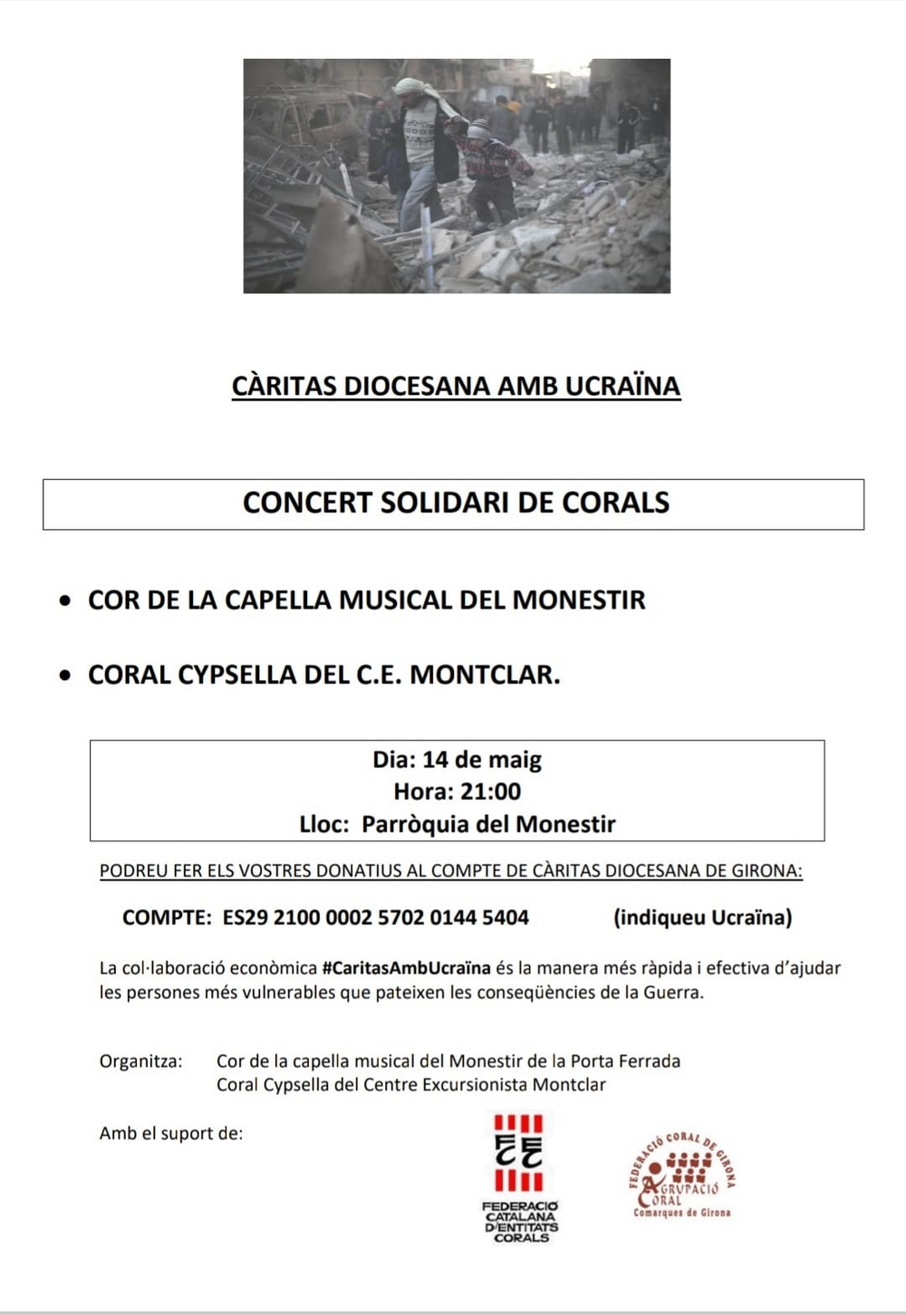 El proper dissabte 14 de maig a les 9 del vespre a la Parròquia del Monestir Mare de Déu dels Àngels de Sant Feliu de Guíxols, concert solidari de corals ‘càritas diocesana amb Ucraïna’.