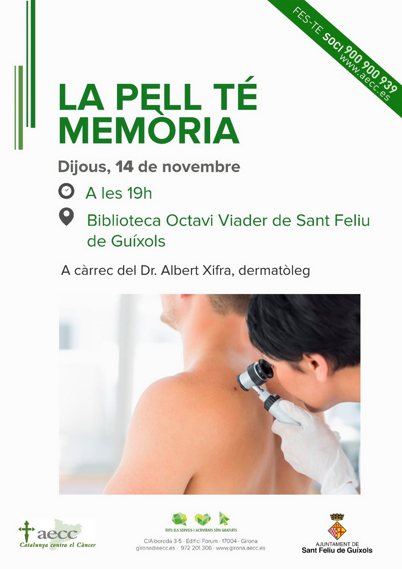El proper dijous a les 19h. conferència sobre el càncer 'La pell té memòria', a càrrec del Dr. Xifra metge especialista en càncer de pell.