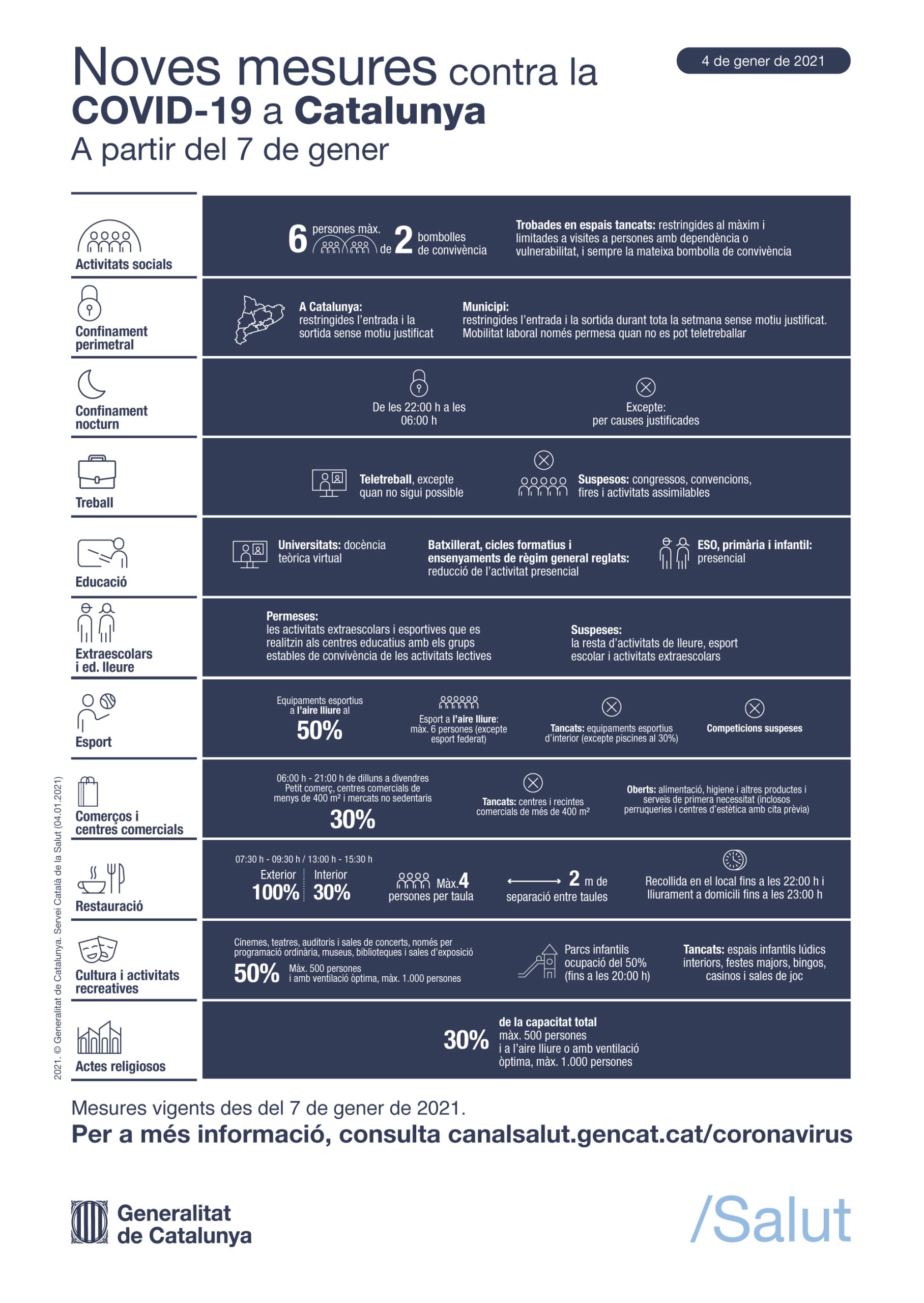 La Generalitat de Catalunya ha anunciat el matí d’avui dilluns, 4 de gener, noves restriccions per a aturar l’increment de casos de Covid-19. Les dades de transmissió del virus tornen a ser preocupants arreu del territori català i per això el Govern ha preparat un paquet de mesures que entraran en vigor passada la diada de Reis, en concret dijous, 7 de gener.