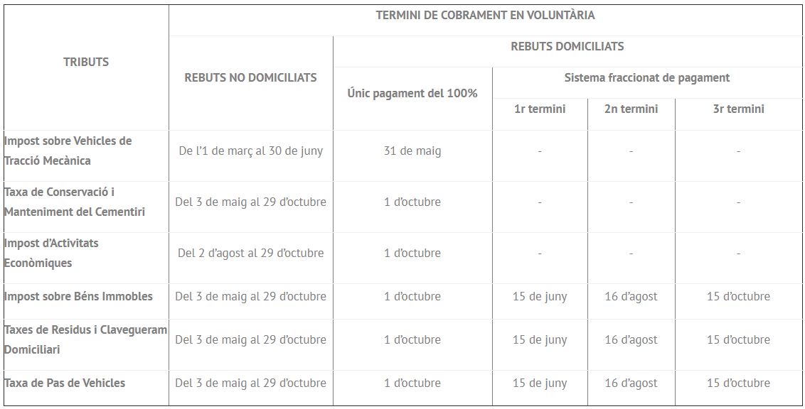 Per a aquest any 2021 s’ha aprovat un procediment excepcional de fraccionament per al pagament dels tributs amb data final de voluntària 29 d’octubre de 2021 per a aquells ciutadans i ciutadanes que ho necessitin.