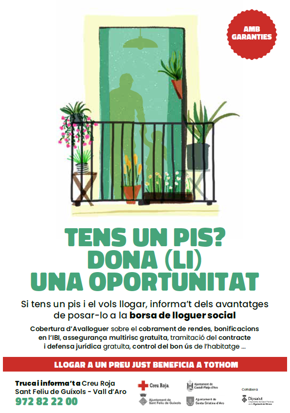 Sota el nom “Tens un pis? Dona (li) una oportunitat”, Creu Roja Sant Feliu de Guíxols-Vall d´Aro impulsa una campanya dirigida als propietaris i propietàries de pisos buits de la Vall d’Aro. És una iniciativa que compta amb el suport de l’Ajuntament de Sant Feliu de Guíxols.