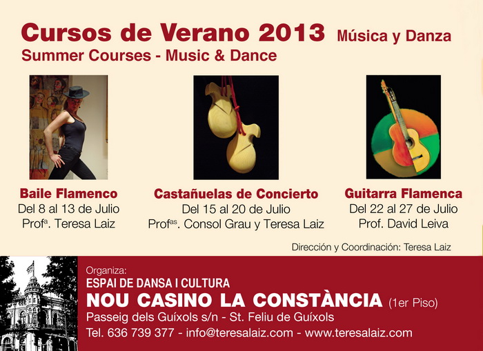 L’Espai de Dansa i Cultura del primer pis del Nou Casino La Constància, dirigit per Teresa Laiz, posa a l’abast de totes les persones amb inquietuds artístiques tres cursos intensius que us poden interessar, impartits per professors i professores experimentats en les diverses tècniques.