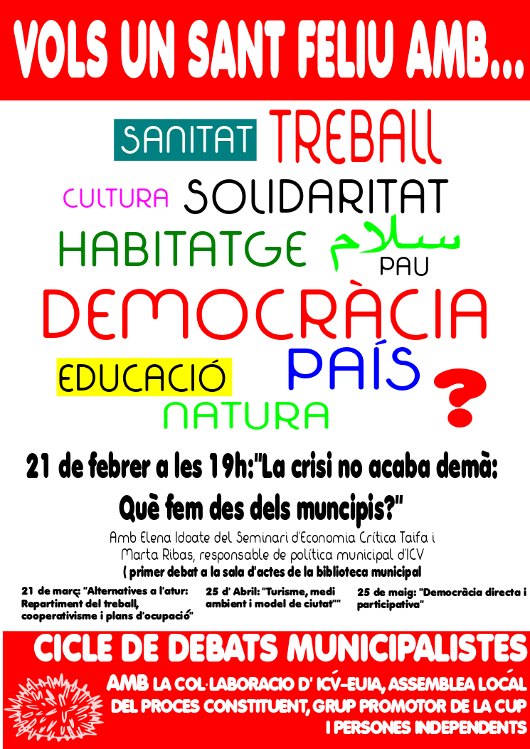 Dos grups polítics de Sant Feliu de Guíxols, ICV-EUiA, el grup promotor de la CUP local i també el moviment ciutadà Assemblea Sant Feliu de Guíxols-Vall d’Aro del Procés Constituent, s’han posat d’acord per impulsar un cicle de debats municipalistes que començarà aquest divendres, 21 de febrer, a les 19h a la Biblioteca Municipal de la ciutat.