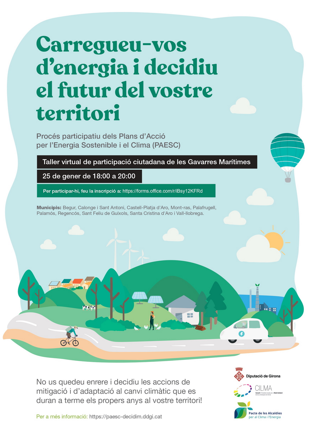 Convoca i anima a la ciutadania a assistir als tallers participatius del PAESC de la nostra Unitat del Paisatge. Demà dimarts dia 25 de gener de 18,00 a 20,00h tindrà lloc el taller virtual ‘Carregueu-vos d’energia i decidiu el futur del vostre territori’.