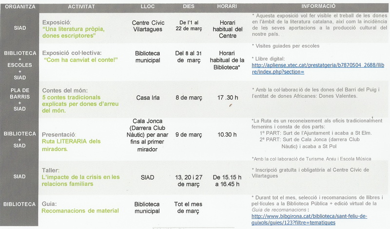 Per tant en un intent d’aproximar als ciutadans i ciutadanes de Sant Feliu de Guíxols aquesta lluita, aquest compromís de futur, i en un intent de commemorar el dia de la dona de forma conjunta, convidem a tots els ganxons i ganxones a participar en tots els actes programats des del Servei d’Igualtat i Atenció a la Dona, la Biblioteca Municipal i Pla de Barris. Us esperem.”