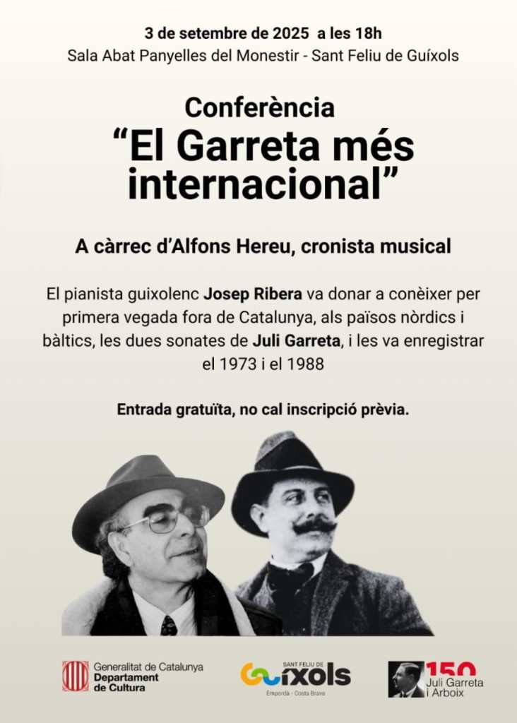 Sota el nom d’’El Garreta més internacional’, aquest dimecres 3 de setembre, al Monestir de Sant Feliu de Guíxols, tindrà lloc una conferència a càrrec del cronista musical Alfons Hereu emmarcada dins la commemoració de l’Any Garreta.